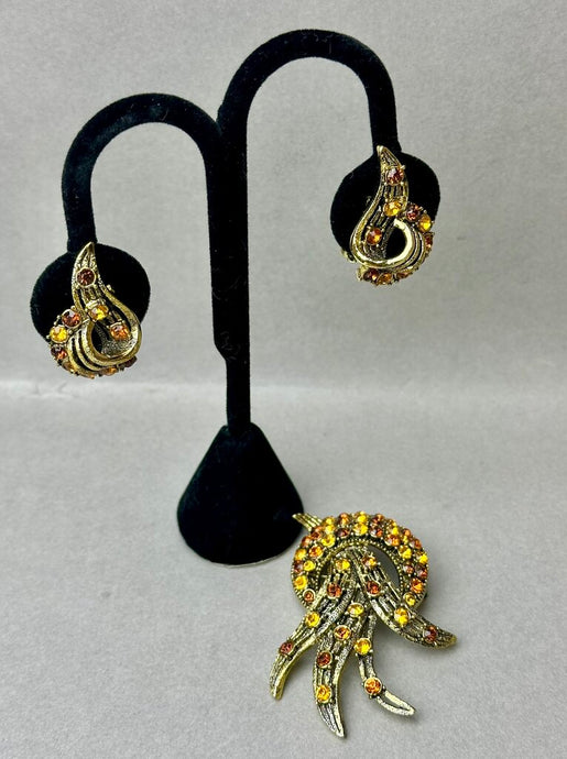 Vintage Bronze Yellow & Orange Rhinestone Brooch Pin & Clip Earrings Set