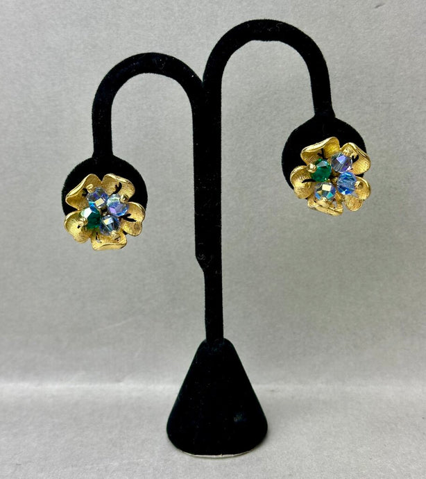 Vintage Coro Blue & Green Aurora Borealis Crystal Flower Clip Earrings