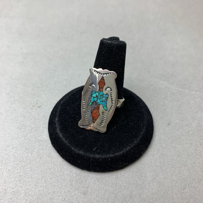 Vintage Sterling Coral Turquoise Chip Inlay Navajo Water Bird Ring sz 6