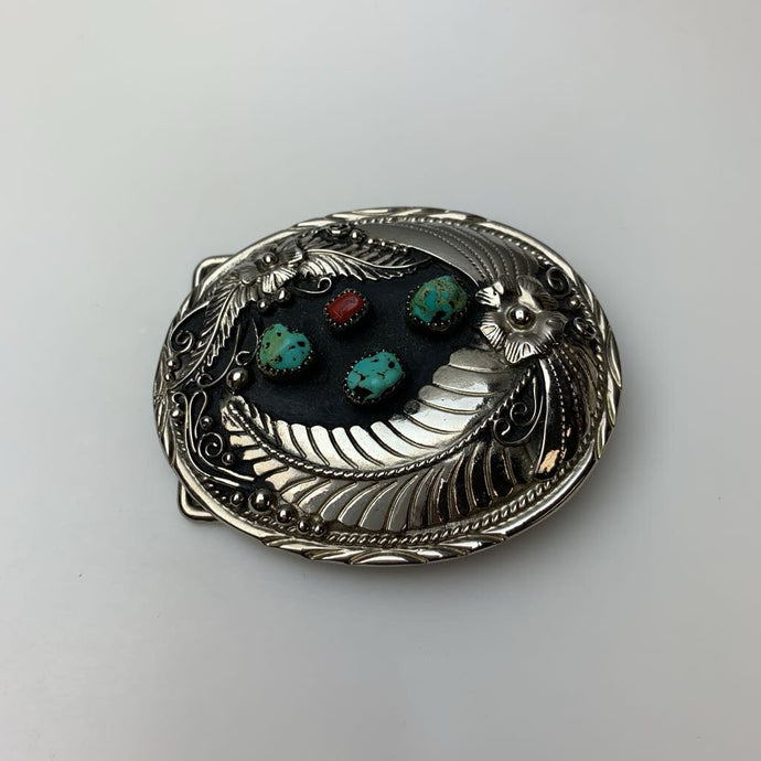 Vintage Native American Silvertone Sterling Plated Front Turquoise Coral Belt Buckle Signed SSI (3x3.5")