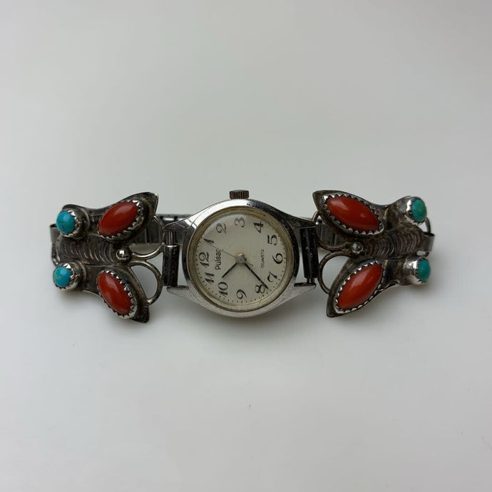 Vintage Sterling Coral Turquoise Butterfly Tips Pulsar Watch Speidel Stretch Stainless Band (Tested, New Battery)
