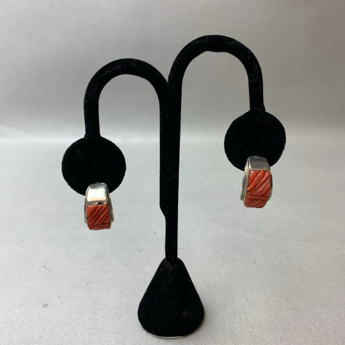 Vintage Navajo Sterling Red Coral Cobblestone Inlay Half Hoop Earrings Garrison Boyd Signed (0.75")