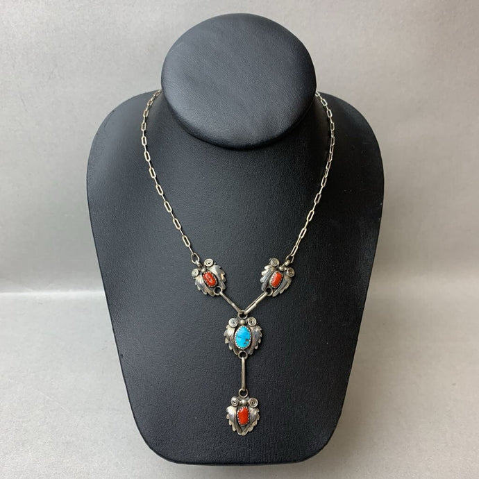 Vintage Native American Sterling Turquoise Red Coral Y-Necklace on Paperclip Chain (17" with 2.25" Drop)