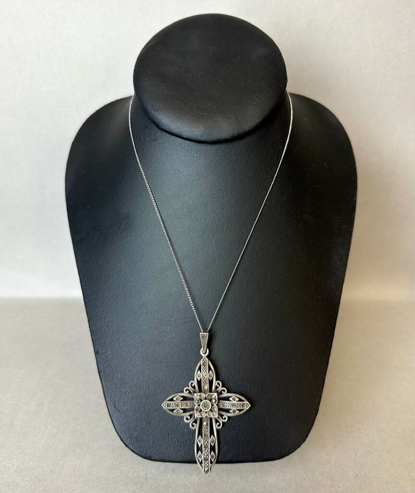 Vintage DBJ Sterling Marcasite 2.5" Cross Pendant on 15" Chain As-Is