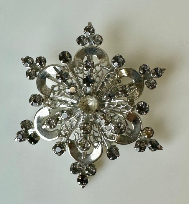 Vintage Gray & Clear Rhinestone Snowflake Brooch Pin (2")