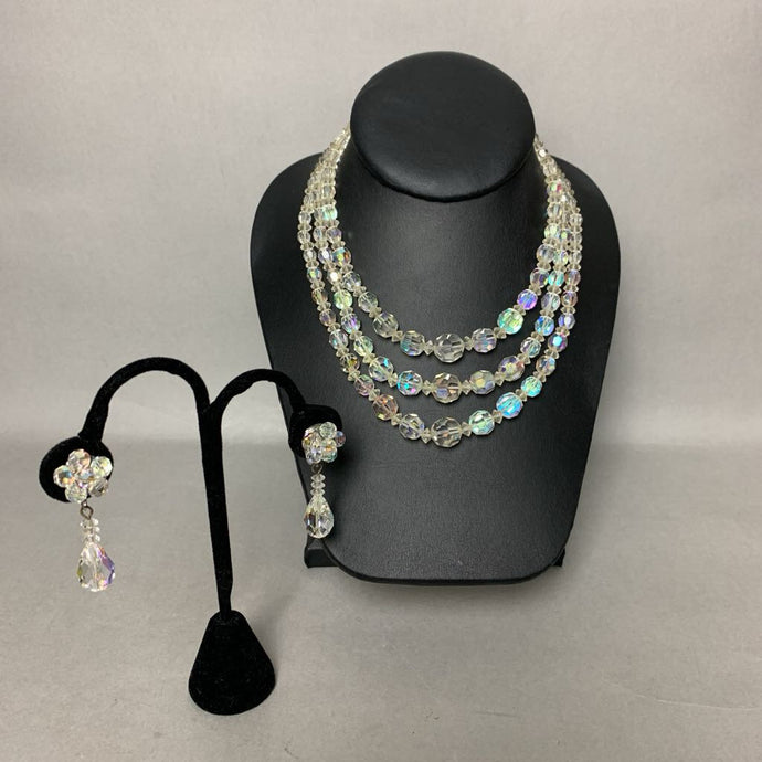 Vintage Clear Aurora Borealis Crystal Bead Triple Strand Necklace w/ Matching Clip Earrings (16")