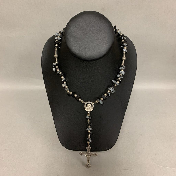 Snowflake Obsidian Chunk Silvertone Beaded Rosary (18" w/ 5" Drop)