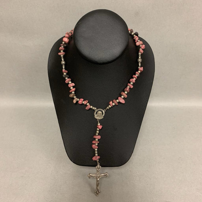 Rhodonite Chunk Silvertone Beaded Rosary (18" w/ 5" Drop)