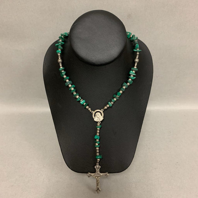 Malachite Chunk Silvertone Beaded Rosary (18" w/ 5" Drop)