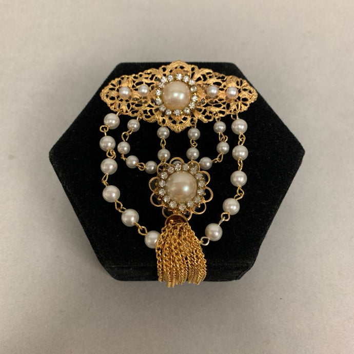 Vintage Victorian Style Goldtone Faux Pearl Swag Brooch Pin (4.5")