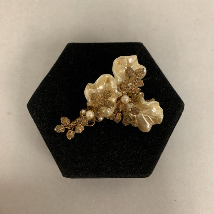 Vintage Miriam Haskell Goldtone Faux Pearl Leaves Brooch Pin Signed (2.5")