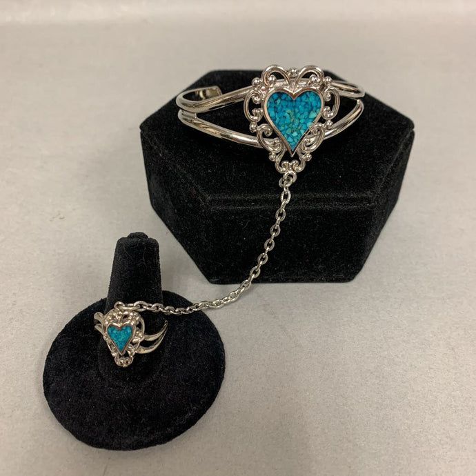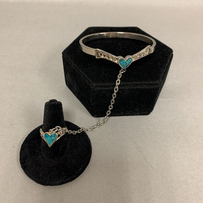 Vintage EJC Silver Tone Chip Turquoise Enamel Heart Cuff Slave Ring Bracelet (sz 8)