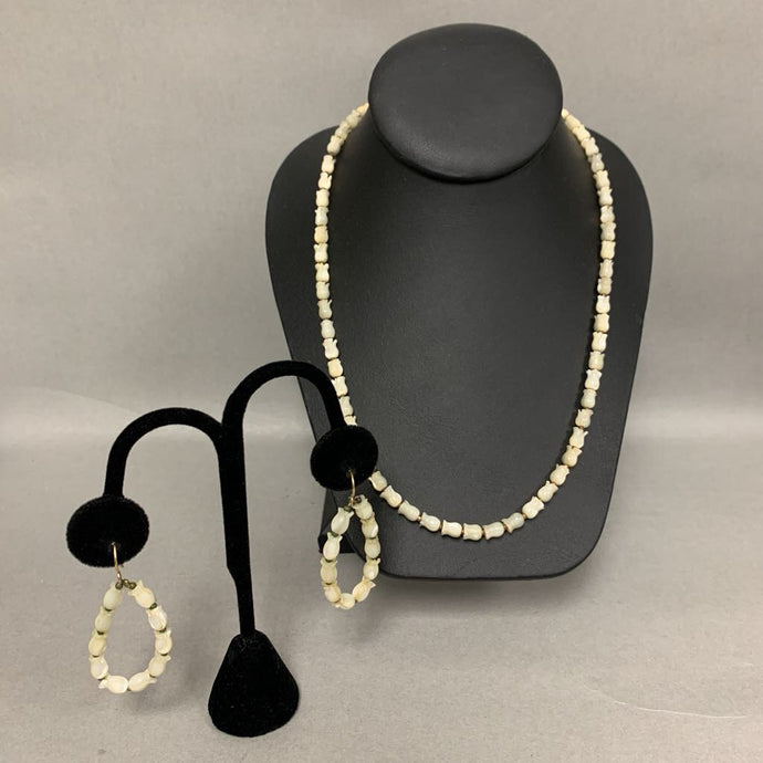 Vintage Carved Mother of Pearl Tulip Beaded Necklace & Earrings Set (20")