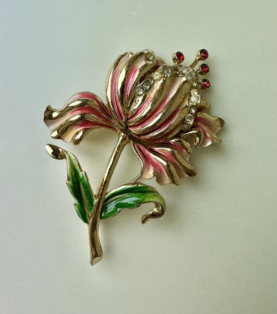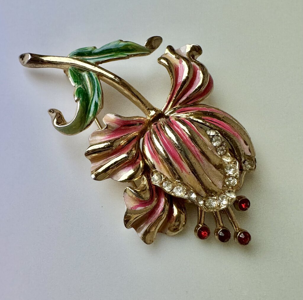 Vintage 3D Goldtone Enamel Rhinestone Flower Brooch Pin (3.75")