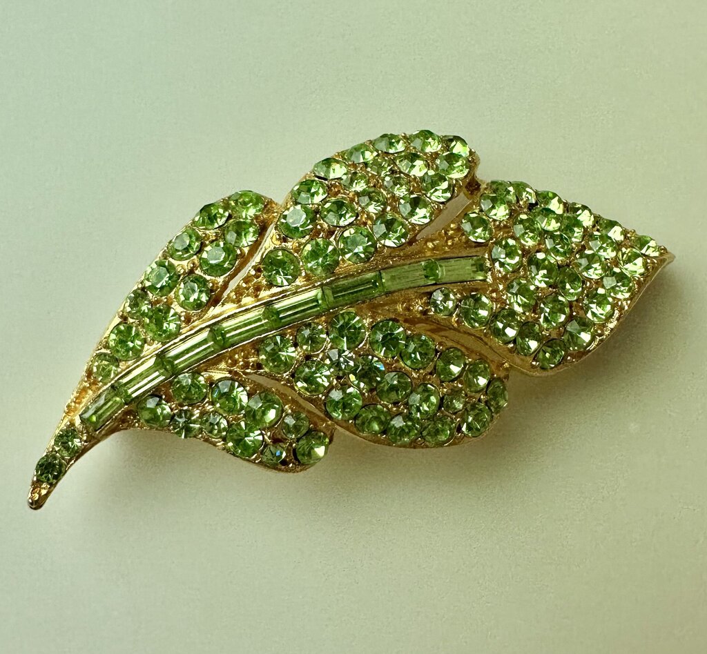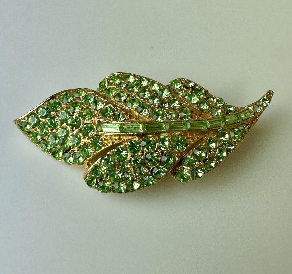 Vintage Bright Green Rhinestone Goldtone Leaf Brooch PIn (2.5")