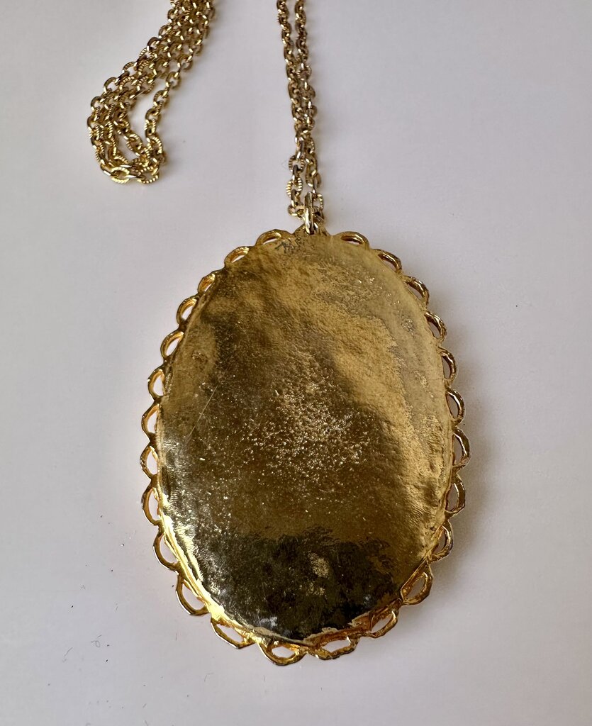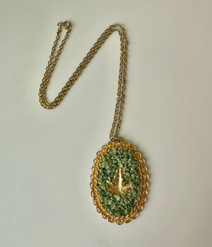Vintage Goldtone Leaf Nephrite Jade Chip Statement Pendant on 24" Chain