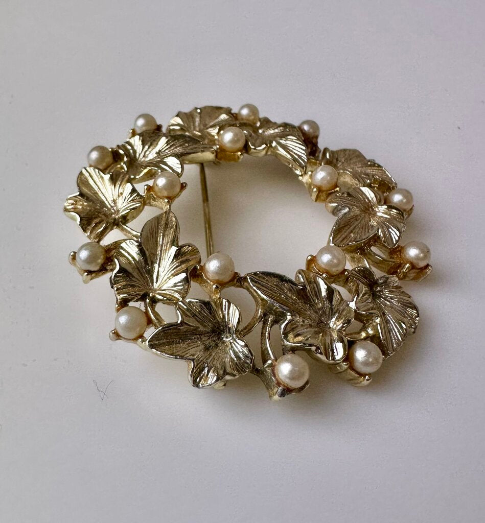 Vintage Lisner Goldtone Faux Pearl Leafy Wreath Brooch Pin (2")