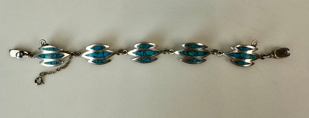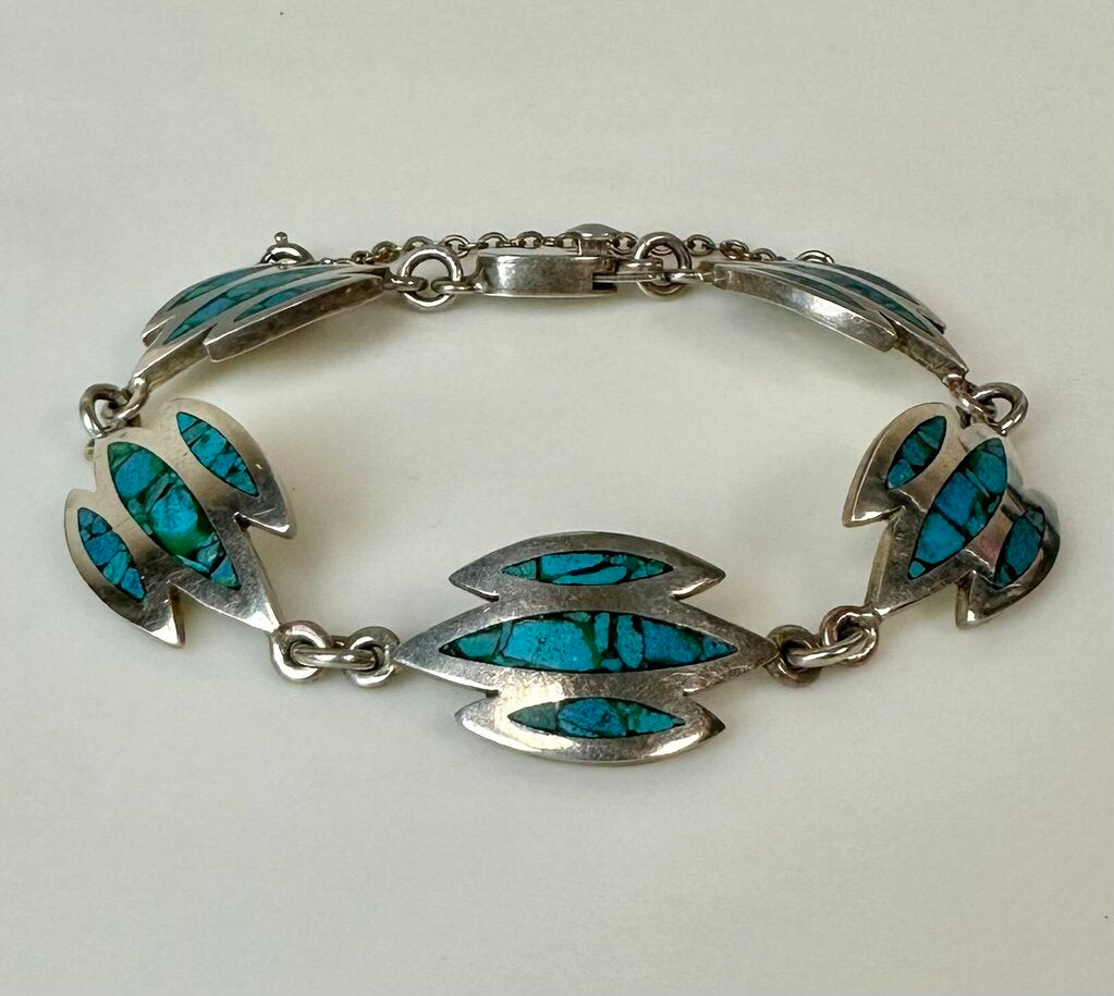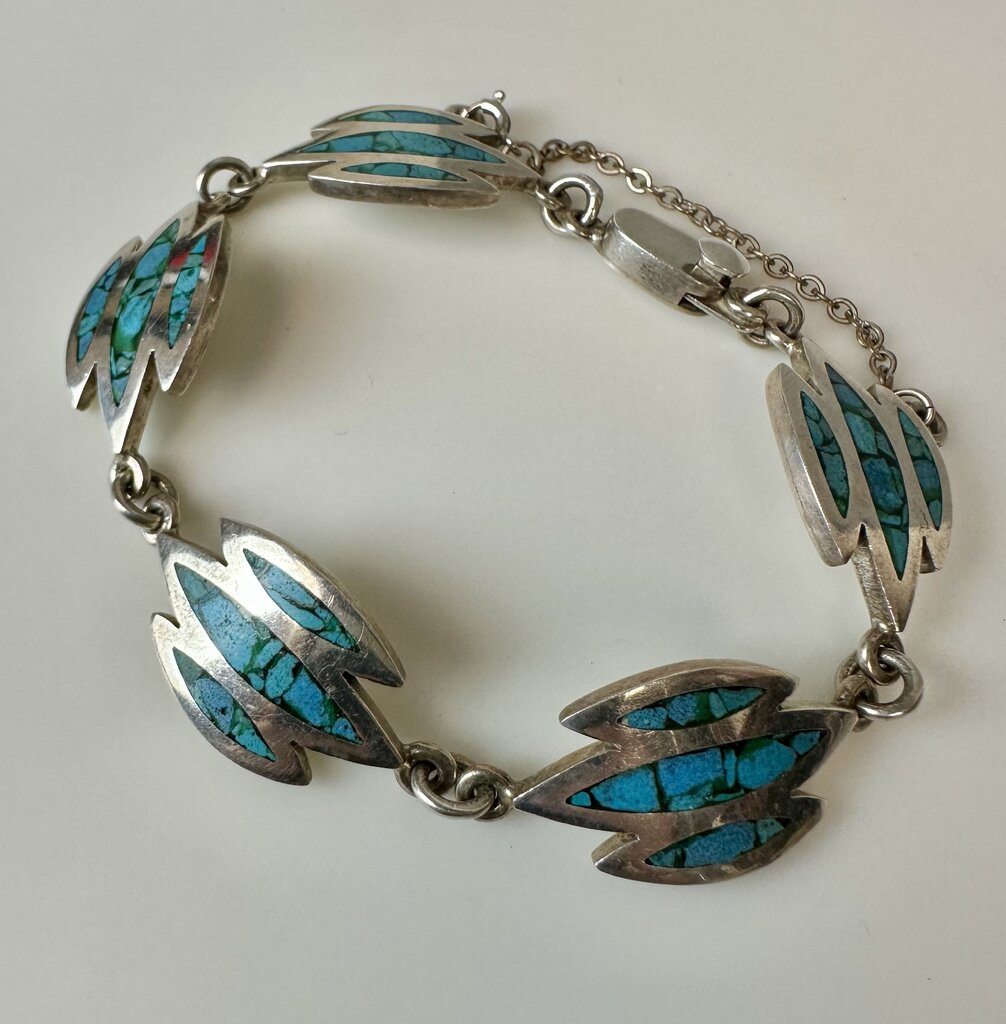 Vintage Taxco Mexico Double Leaf Sterling Turquoise Chip Inlay Link 7" Bracelet (25.4g)