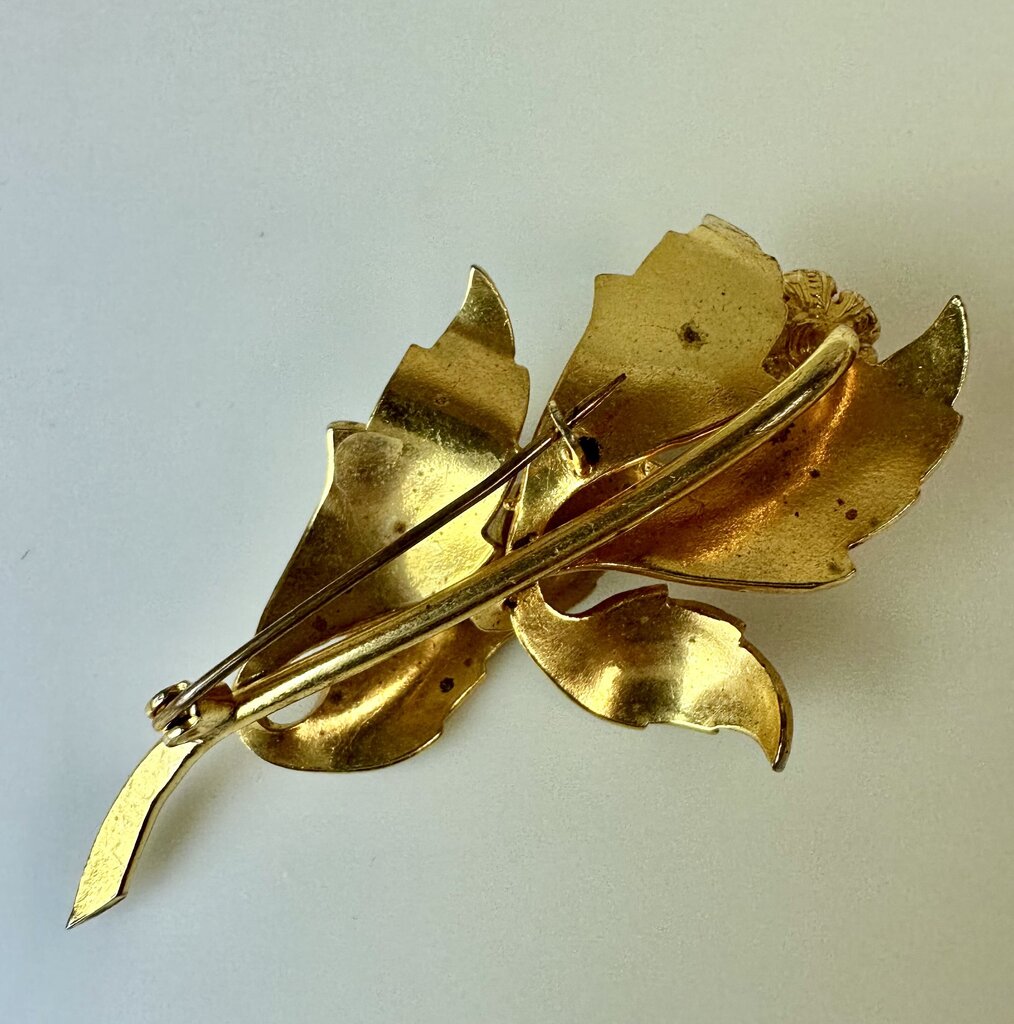 Vintage Toledo Enamel Damascene Faux Pearl Leaves Brooch Pin (2.5")
