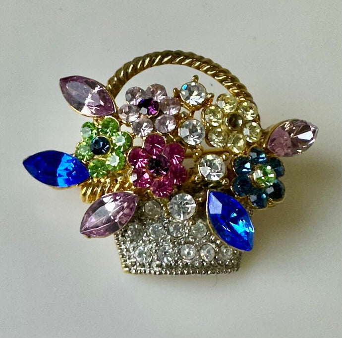 Vintage Colorful Rhinestone Basket of Flowers Brooch Pin (1.25")