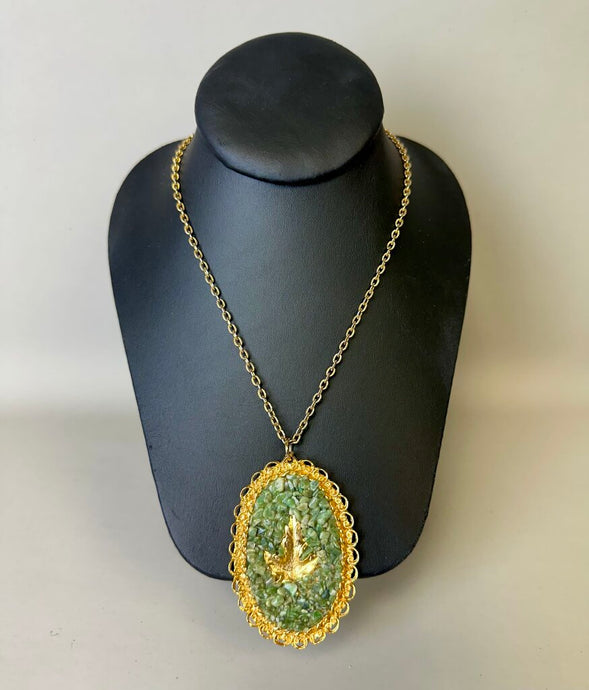 Vintage Goldtone Leaf Nephrite Jade Chip Statement Pendant on 24" Chain