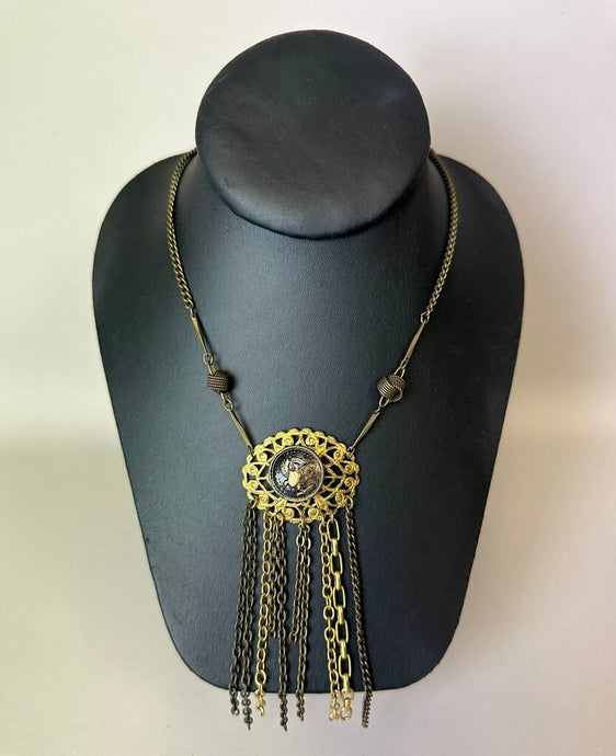 Vintage Lenora Dame Brass Goldtone Eagle Button Fringe Necklace (19")
