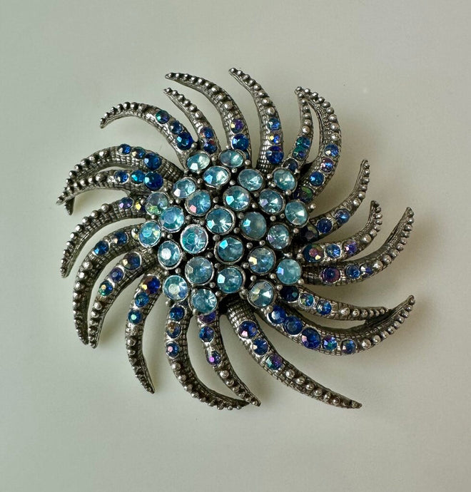 Vintage Antiqued Silver Blue Aurora Borealis Rhinestone Pinwheel Brooch Pin (2.5")