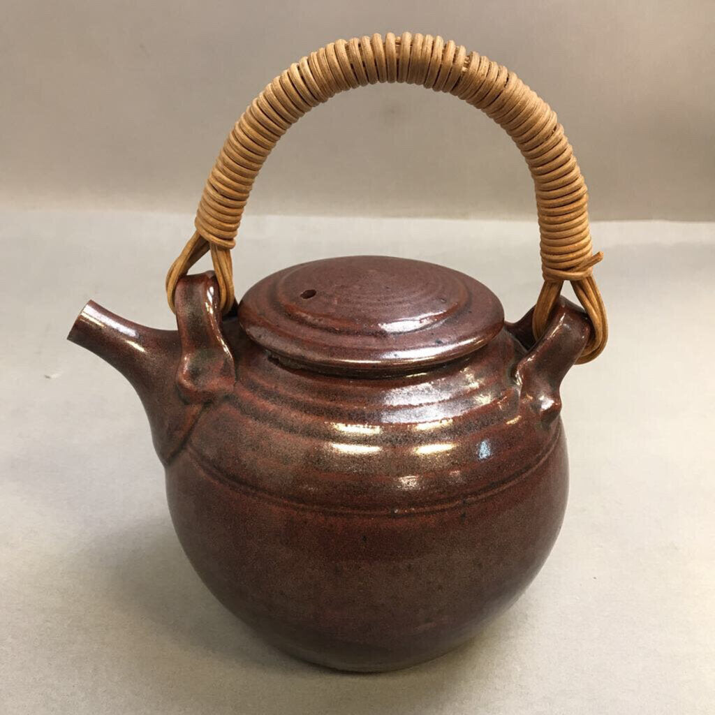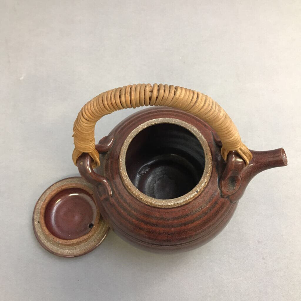 Antique Brown Stoneware Pottery Tea Pot Rattan Handle (6")