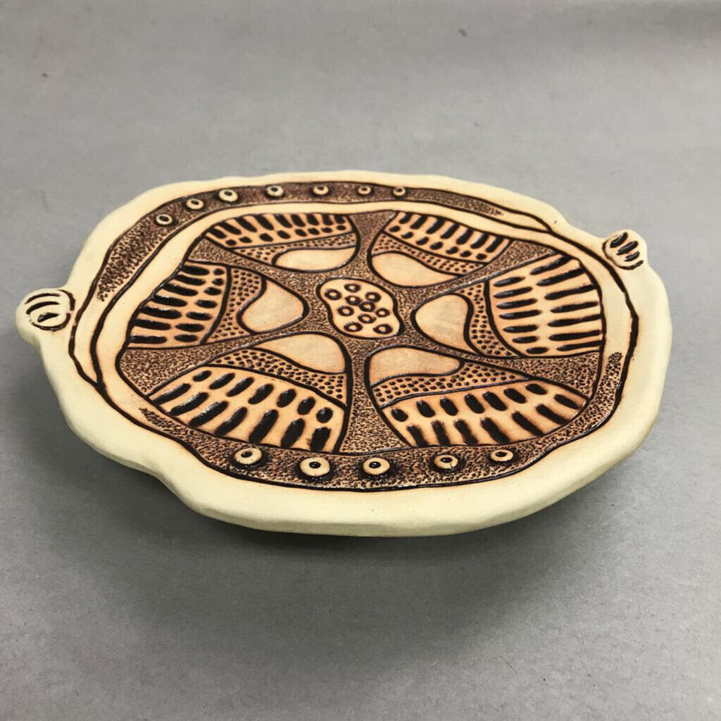 Black/Brown Folk-Inspired Pedestal Pottery Plate, Signed "MB" (~2x10x9)