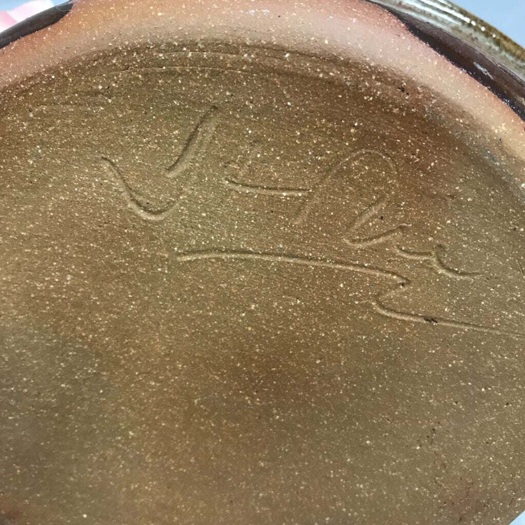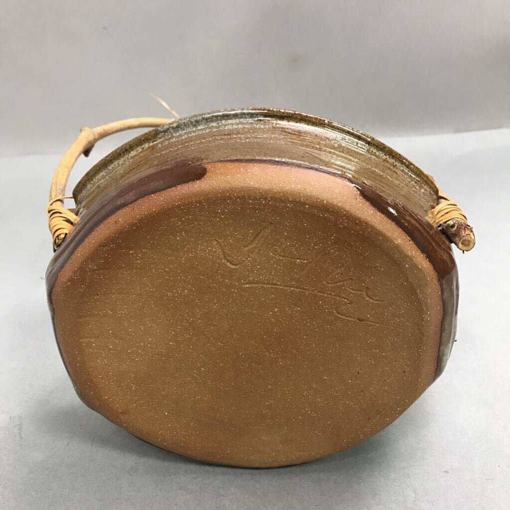 Glazed Pottery Basket with Bamboo Handles Signed (11")