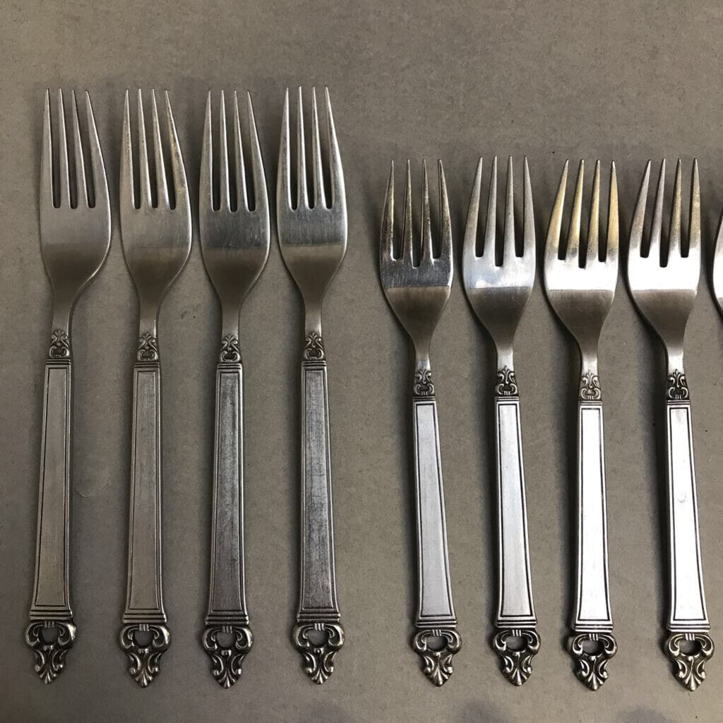 Includes: 4 dinner forks; 6 salad forks; 10 teaspoons; 7 place/oval soup spoons; 6 dinner knives; 1 serving spoon.