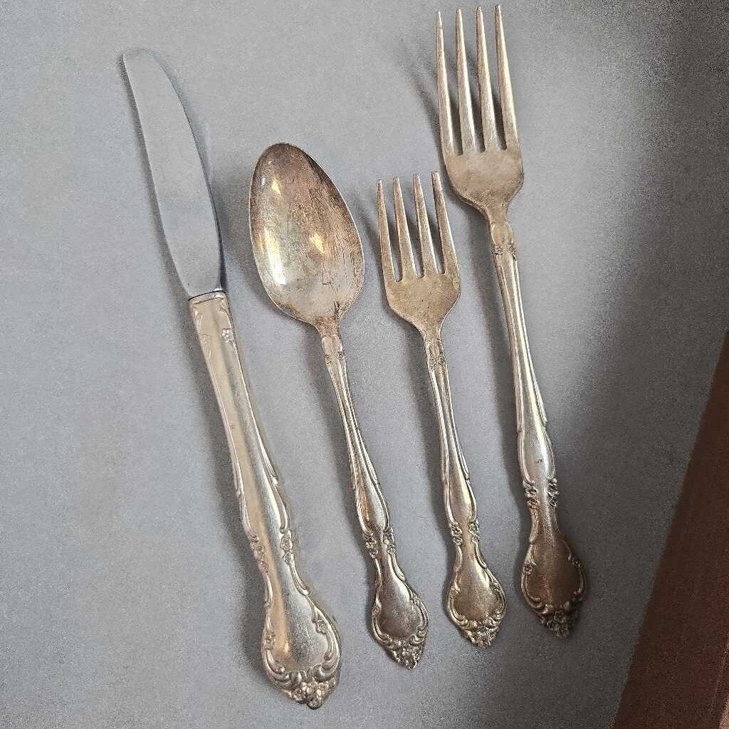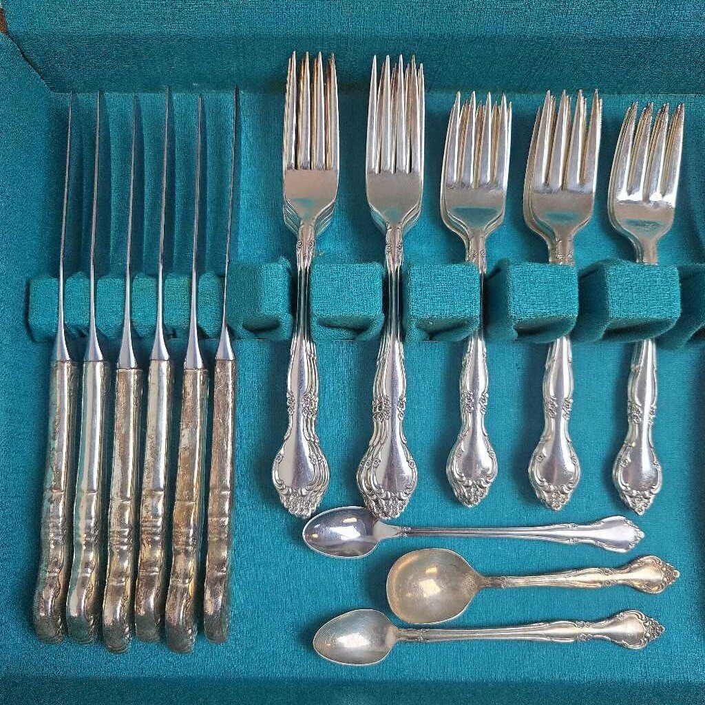 12 dinner forks; 11 salad forks; 12 dinner knives; 24 tea spoons; 12 place spoons; 4pc child's set; 12 serving pieces.