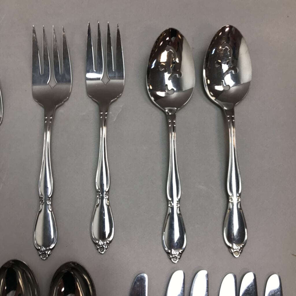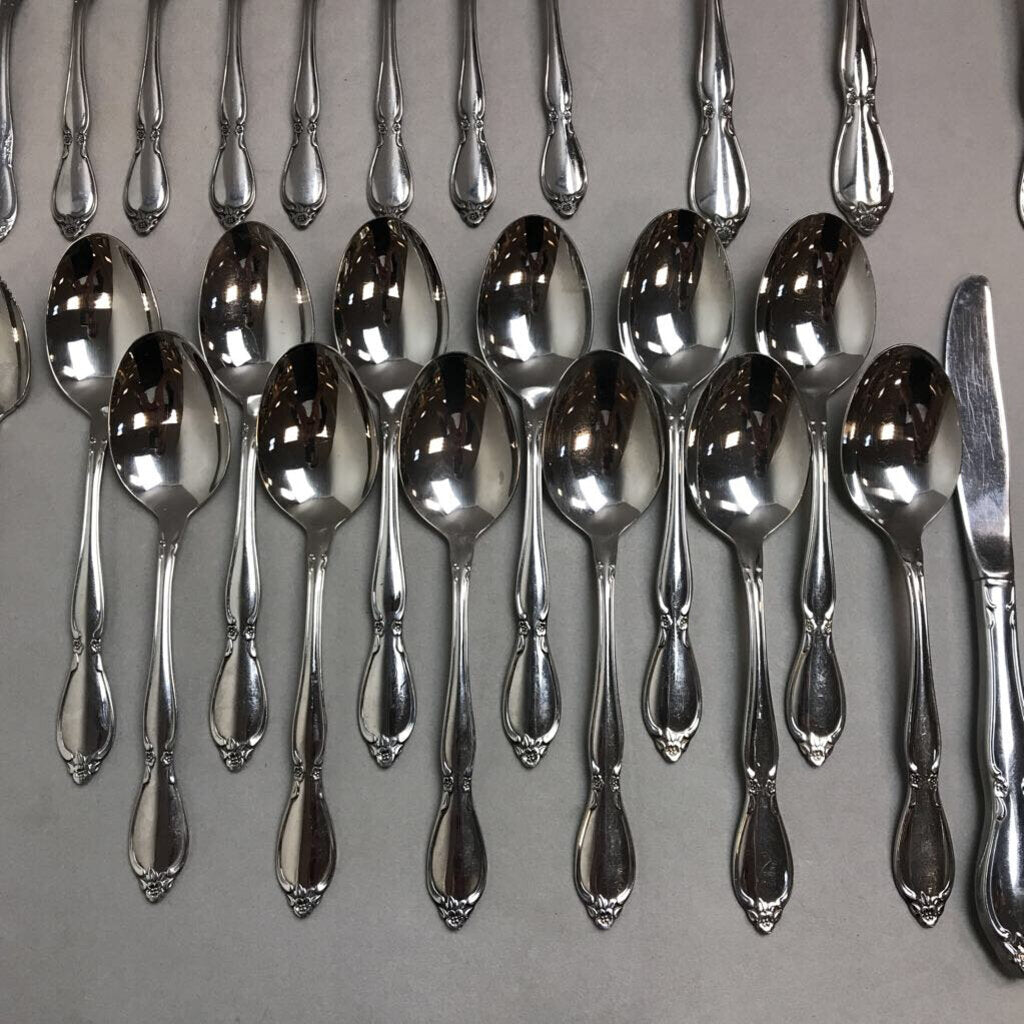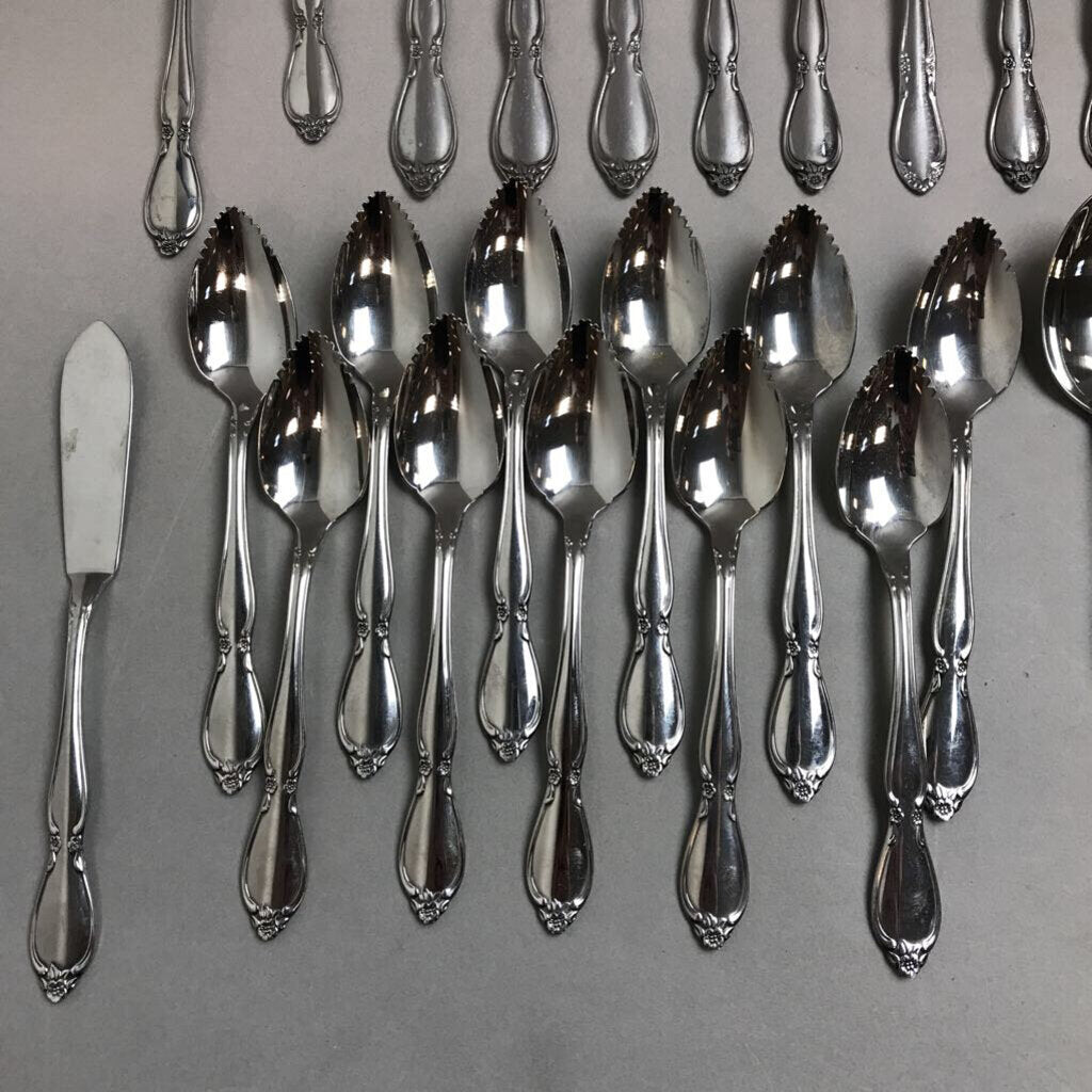 3 dinner forks; 10 salad forks; 11 fruit/orange spoons; 12 place/soup spoons; 2 gumbo spoons; 6 dinner knives; 5 serving pieces