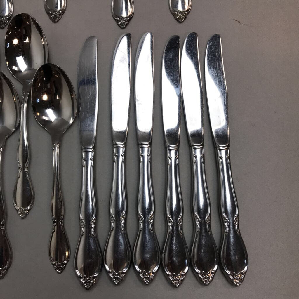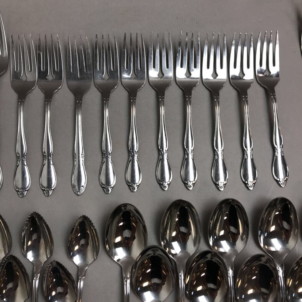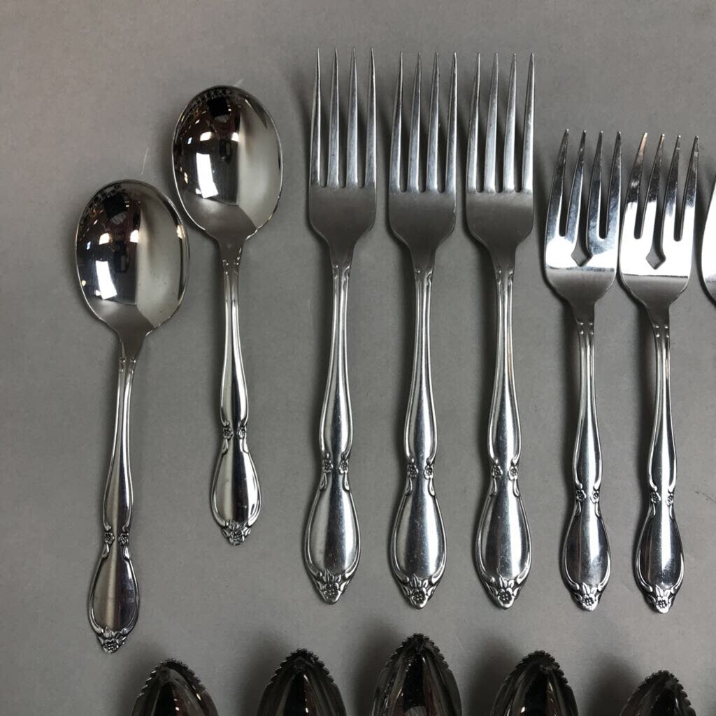 3 dinner forks; 10 salad forks; 11 fruit/orange spoons; 12 place/soup spoons; 2 gumbo spoons; 6 dinner knives; 5 serving pieces