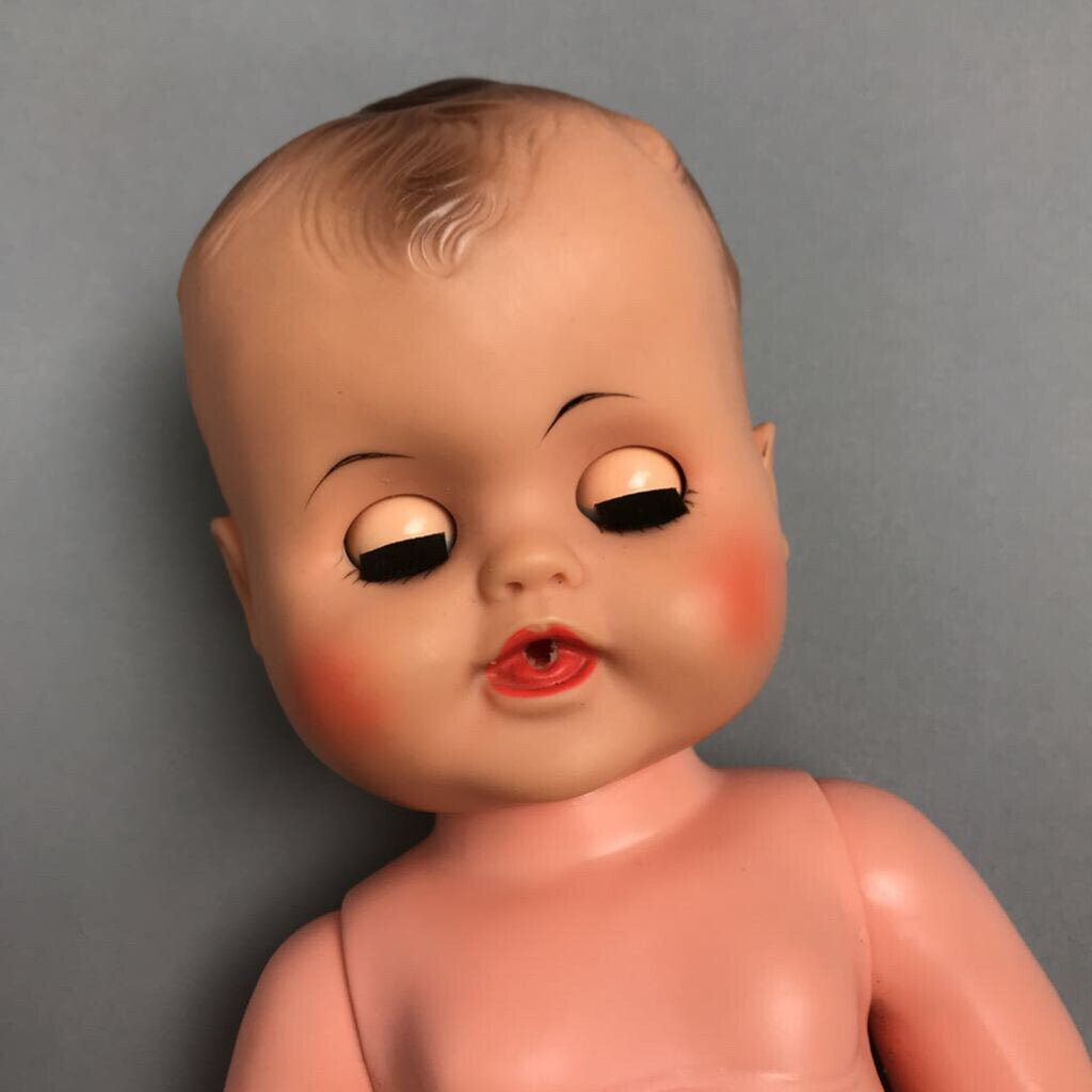 Rubber head, vinyl body; "drink and wet"; sleepy eyes.