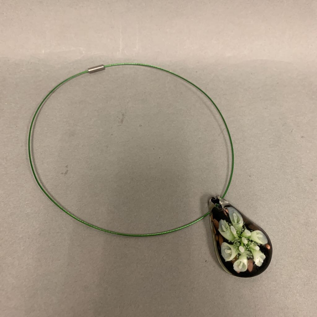 Art Glass Lilies Pendant on Green Wire Necklace (18")
