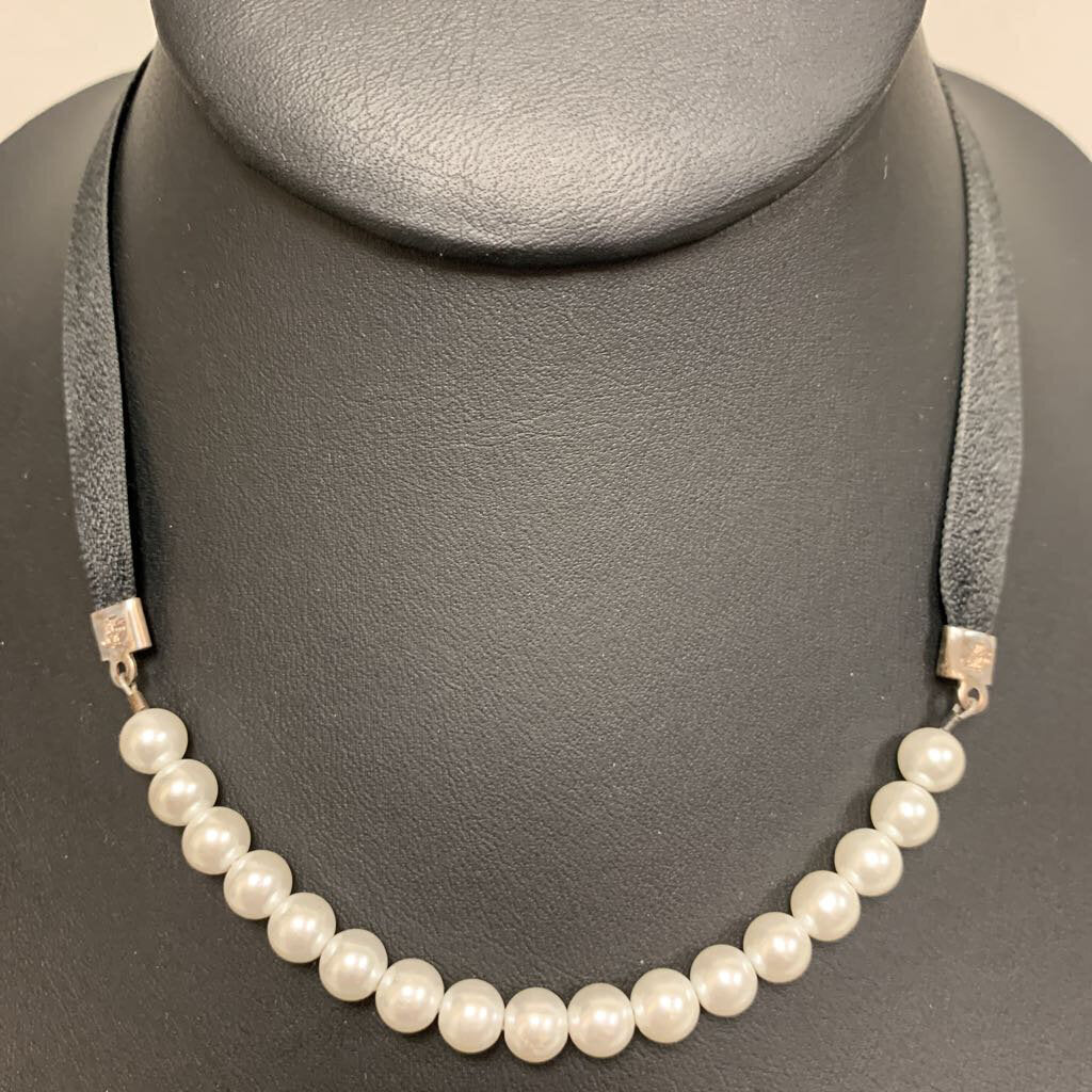 Pearl & Black Ribbon Toggle Choker Necklace (16")