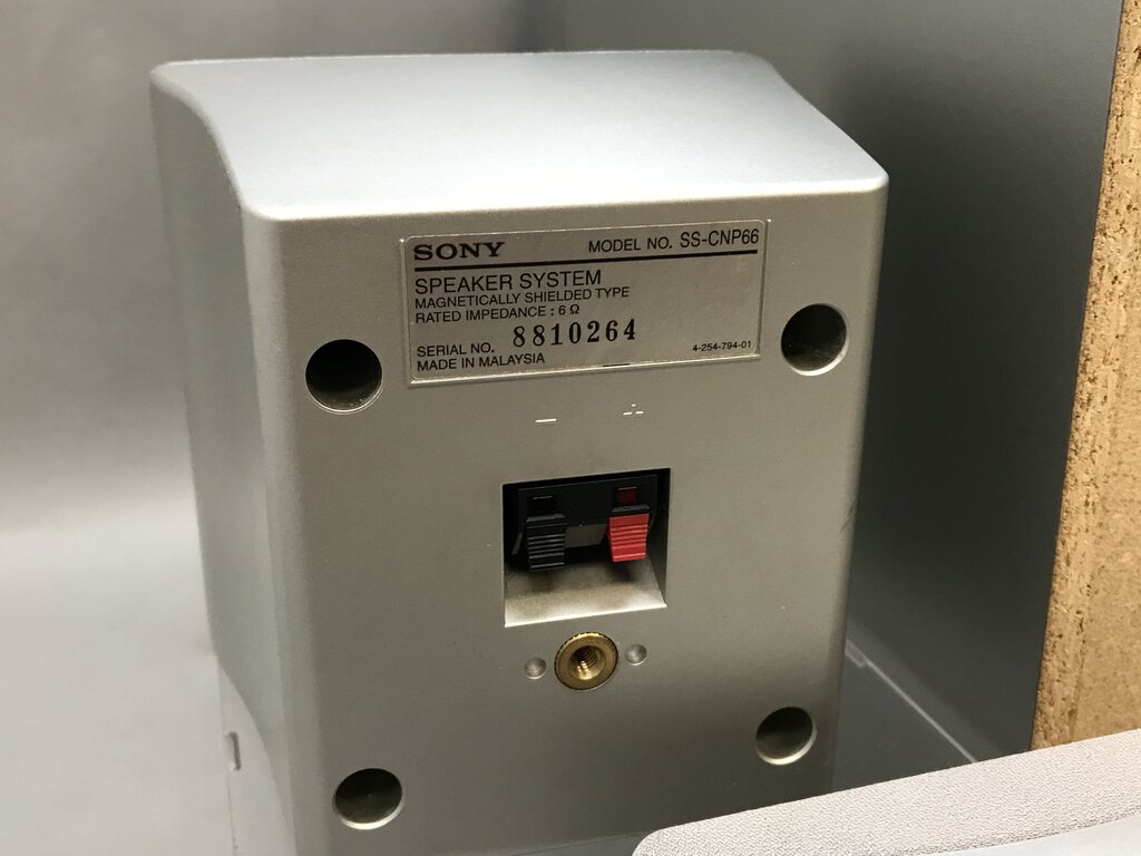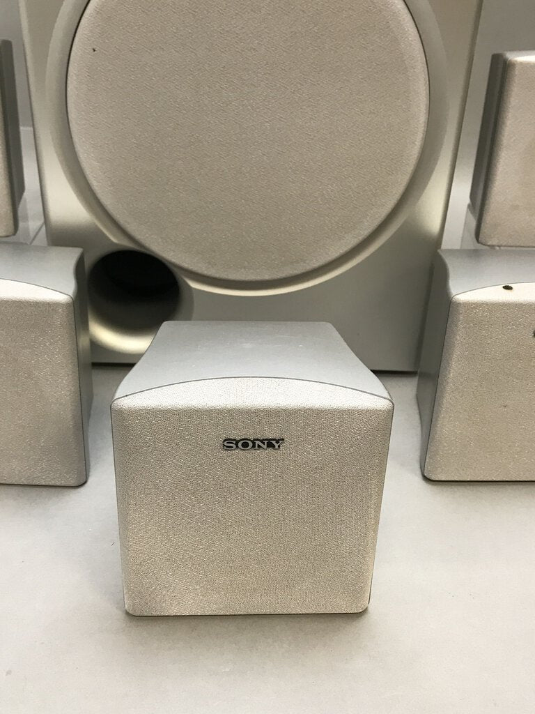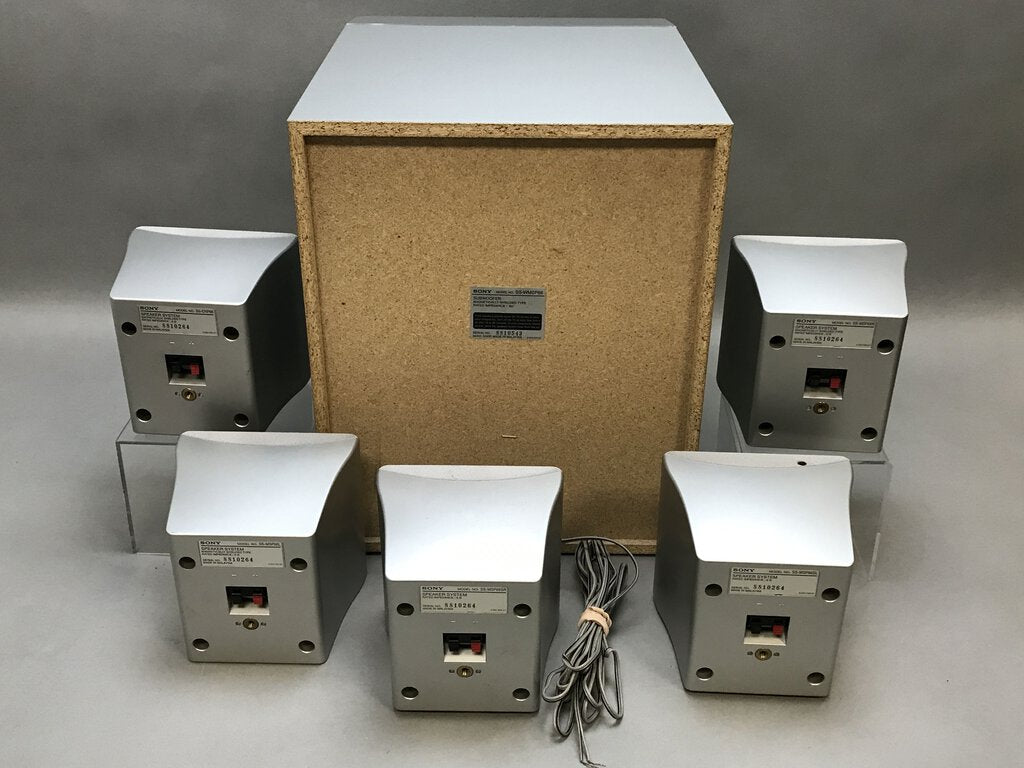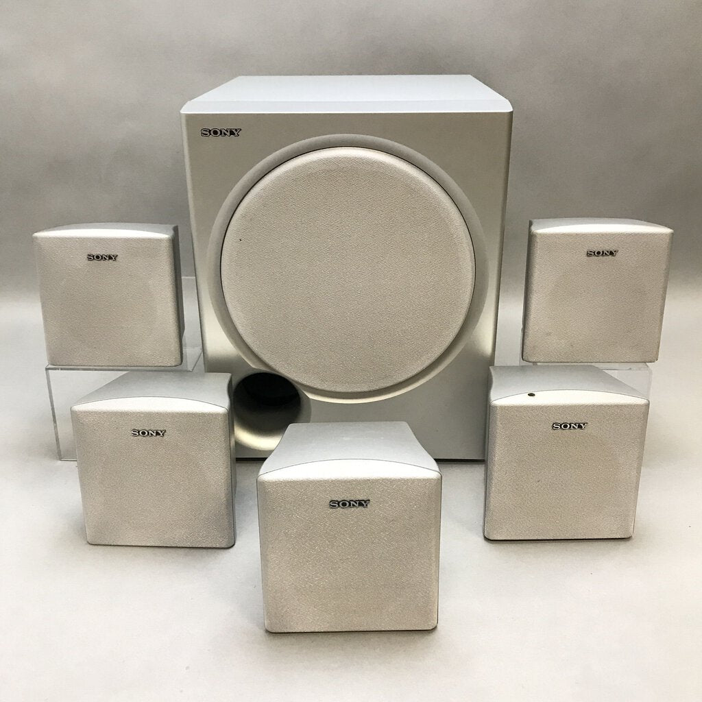 Sony Surround Sound Speaker System; Subwoofer (13") w/ 5 Satellite Speakers (5"). Good cosmetic condition. Some superficial wear from age/use.