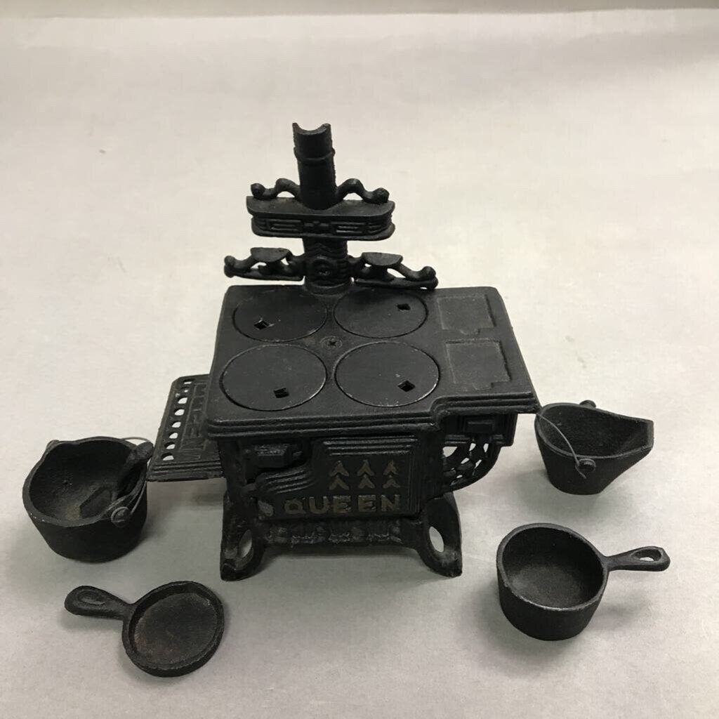 Vintage Cast Iron Queen Miniature Wood Burning Stove Salesman Sample w/ Accessories (3x5)