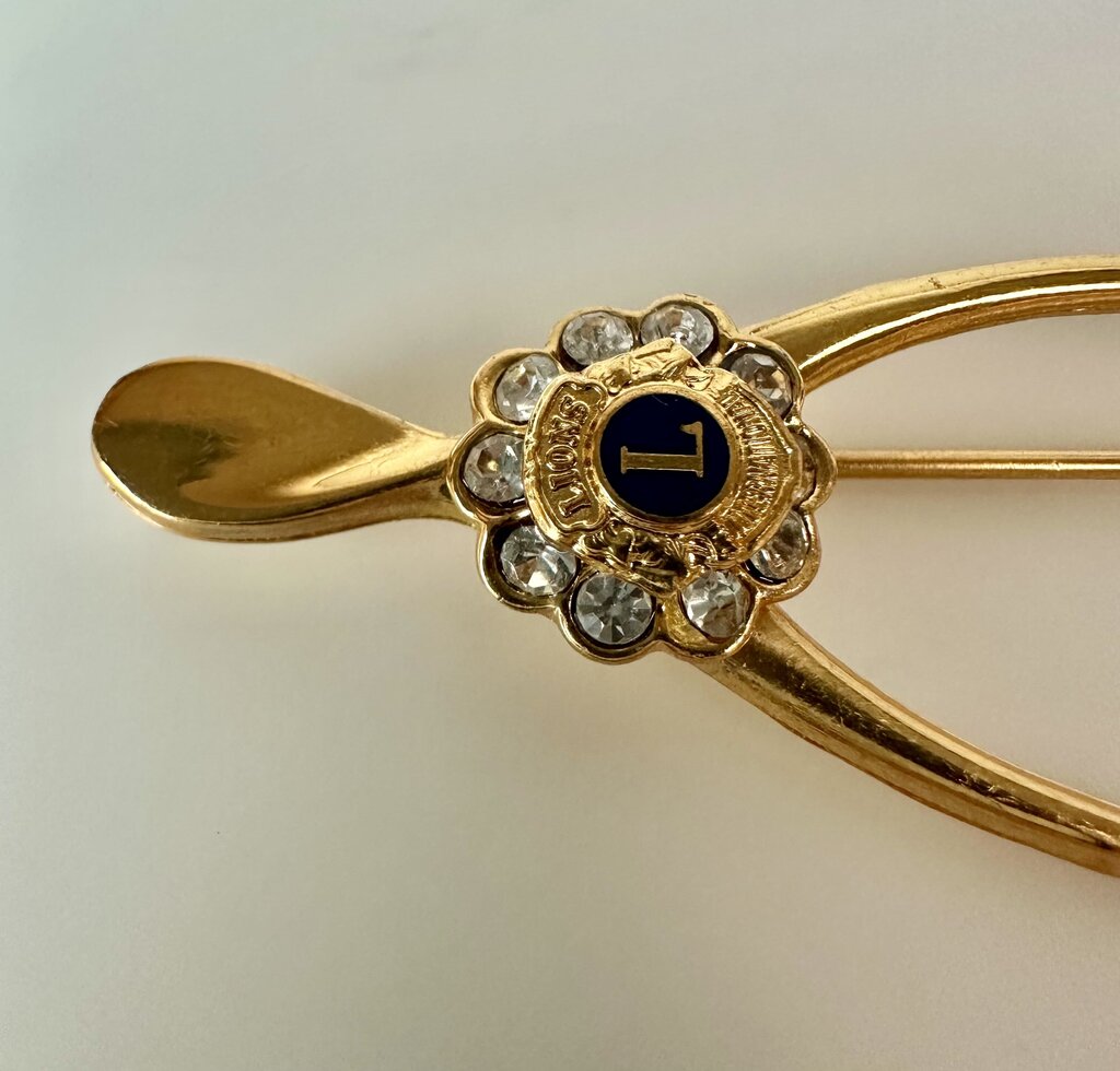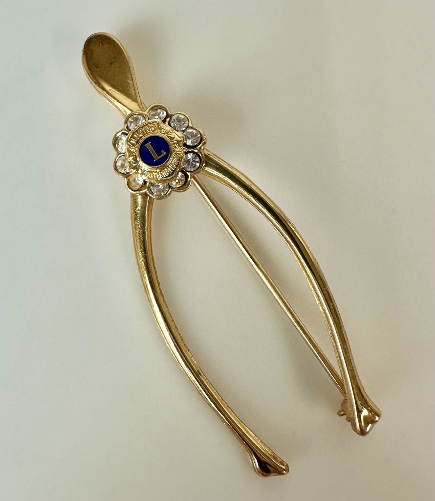Vintage Lions Club Goldtone Rhinestone Enamel Wishbone Brooch Pin (2.5")