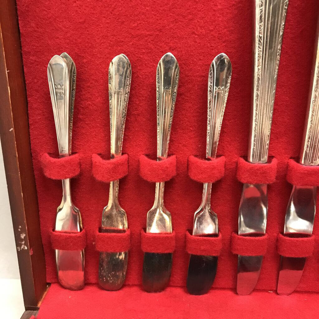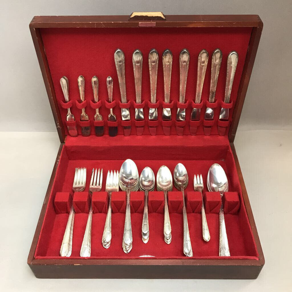 Includes: 8 dinner forks; 7 salad forks; 8 soup/place spoons; 14 teaspoons; 8 iced tea spoons; 8 cocktail/seafood forks; 8 dinner knives; 8 place butter spreader knives; & 2 serving spoons